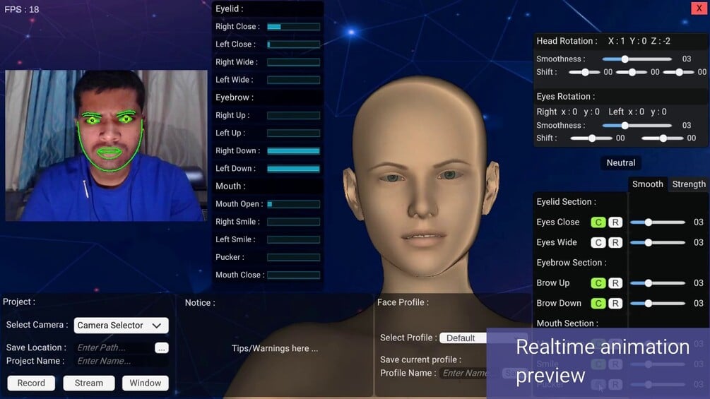 Cheapest and easy-to-use facial motion capture system made for indie 3d animators. This software doesn't require any fancy setup for facial motion capture. Just open software, record video with a normal webcam (No depth sensor or iPhone needed!), and retarget animations to your own 3d character with just a few clicks. But for this tool to work your character needs to have apple Arkit shapekeys and a windows operating system.